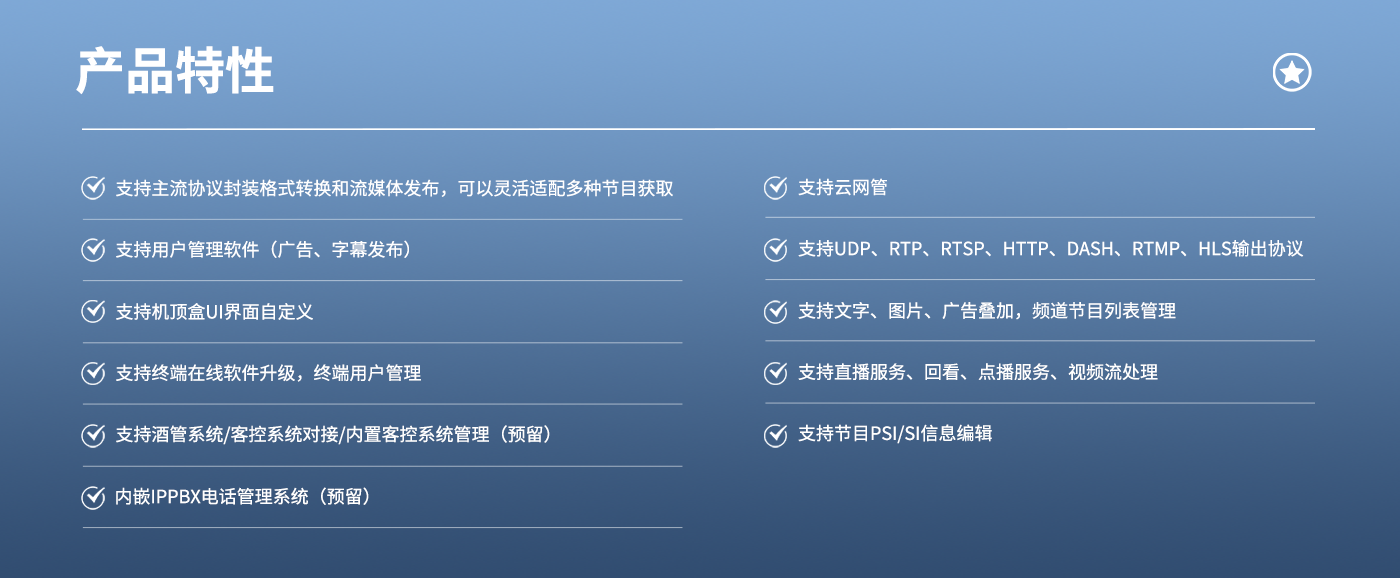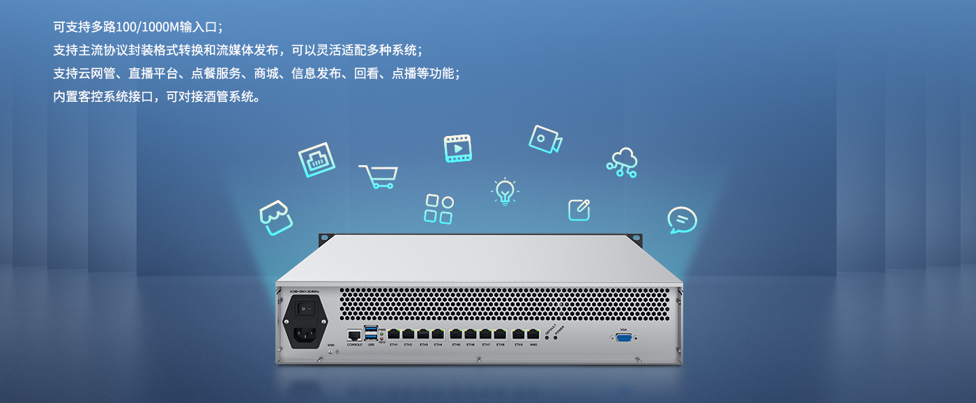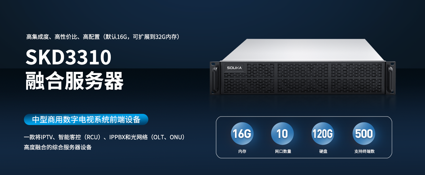 SKD3310是一款适用于商旅酒店、会所、医院、浴场、学校、休闲会所等场所的中型商用IPTV或数字电视系统的前端设备(支持终端数500及以下)。该产品具有高集成度、高性价比、高配置(默认16G,可扩展到32G内存)的播控服务器产品。可支持多路100/1000M输入口,支持主流协议封装格式转换和流媒体发布,可以灵活适配多种系统。支持云网管、直播平台、点餐服务、商城、信息发布、回看、点播等功能,内置客控系统接口,可对接酒管系统。