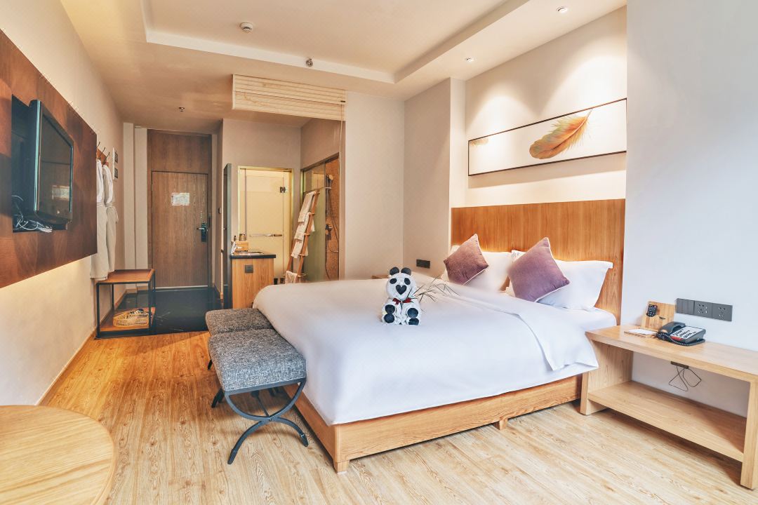 酒店采用鼎盛威集成模块型客控方案,打开房门进入迎宾模式,多种模式可随意切换,前台管理功能实现实时房态查询,可自由扩展语音控制、微信控制、系统对接等。方案采用弱控强的设计理念,安全性高,搭配485开关,接线少,布线少,操作方便。酒店设备全智能化,环境干净整洁,自动窗帘电机能轻松的看到窗外风景,后台可以轻松控温,让客户感受在外的温暖。