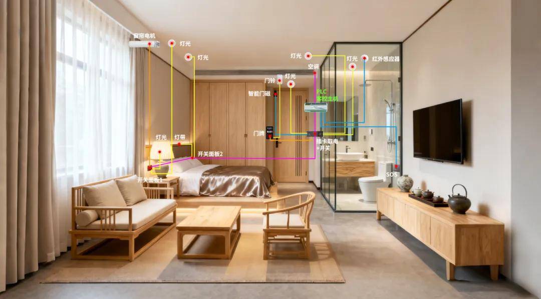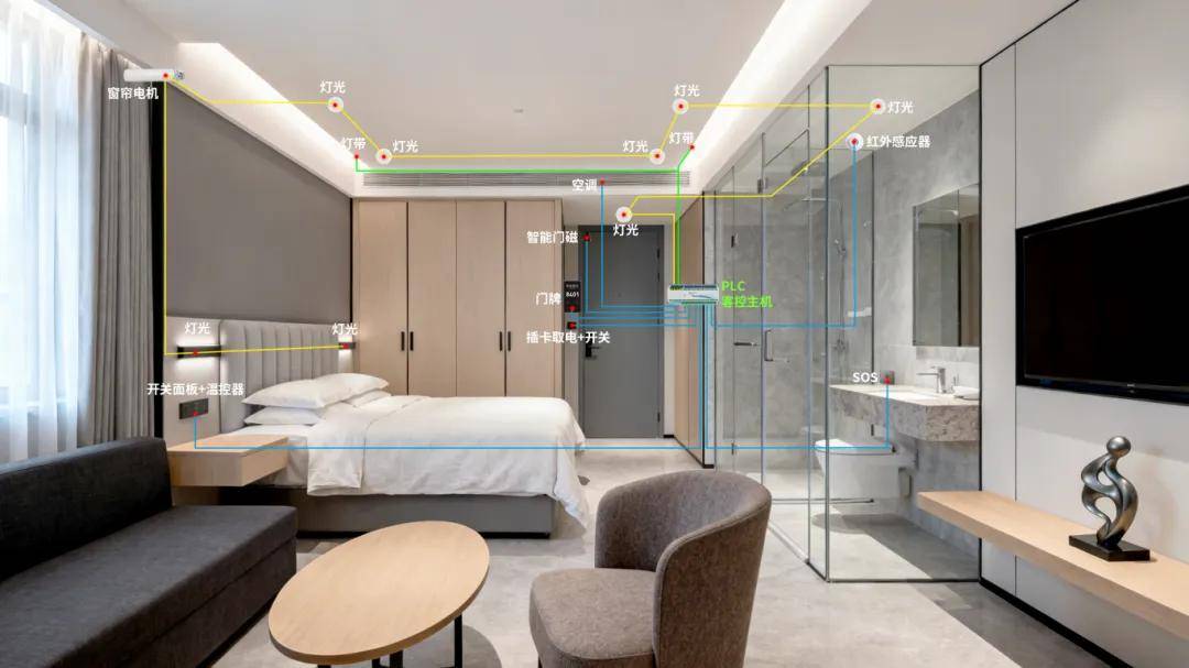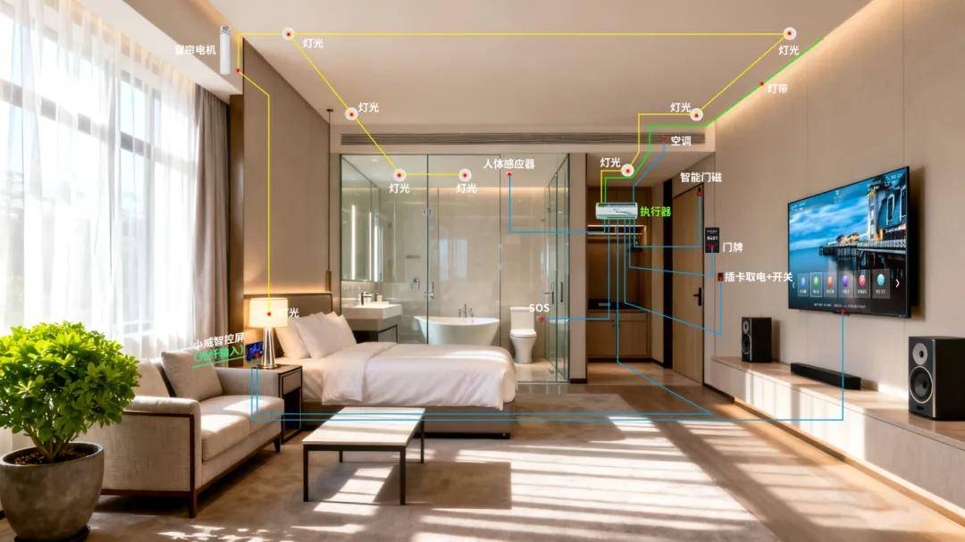 本系统扩展性强,可接入小网关与互联网,实现小程序、AI语音、自动开锁、人脸识别和远程升级等全栈能力,覆盖从基础照明控制到完整的场景化服务。安装调试简化,普通电工即可完成安装,一日可覆盖多房间,显著提升施工效率:日常维护也由现场电工执行,非专业人员到场需求降低,开房影响降至最低。