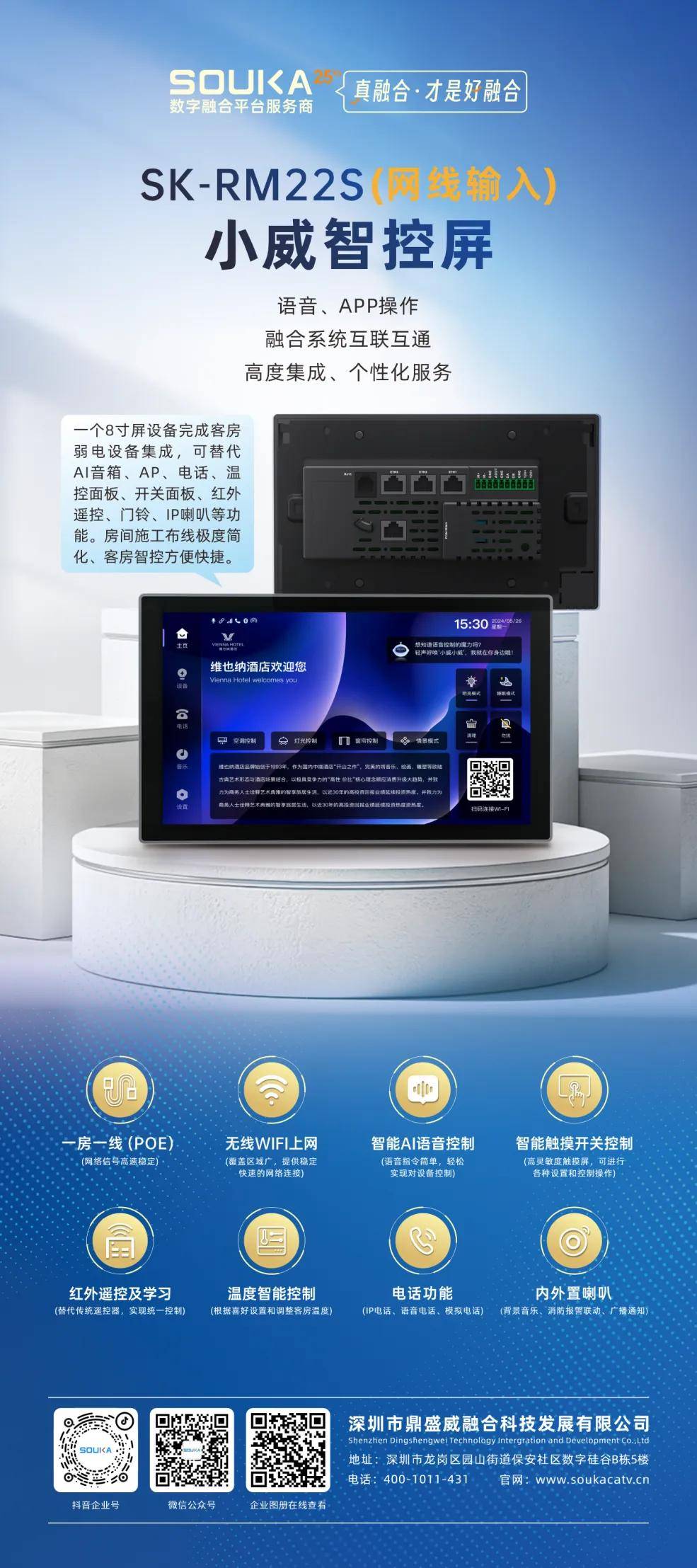 现场,韩总还重点介绍了鼎盛威近期推出的小威智控屏。这款新产品的设计,从外观到功能都透着对实际需求的考量:外观上,简洁大方的造型能轻松融入各类酒店装修风格,不会因设备突兀破坏空间美感;功能上,它更是做了细致的整合 —— 将 AI 音箱、ONU、AP、电话机、空调面板、开关面板、红外遥控与喇叭等常用功能融于一体,无需在客房内叠加部署多台设备,既节省了安装空间,也减少了后续维护的繁琐。