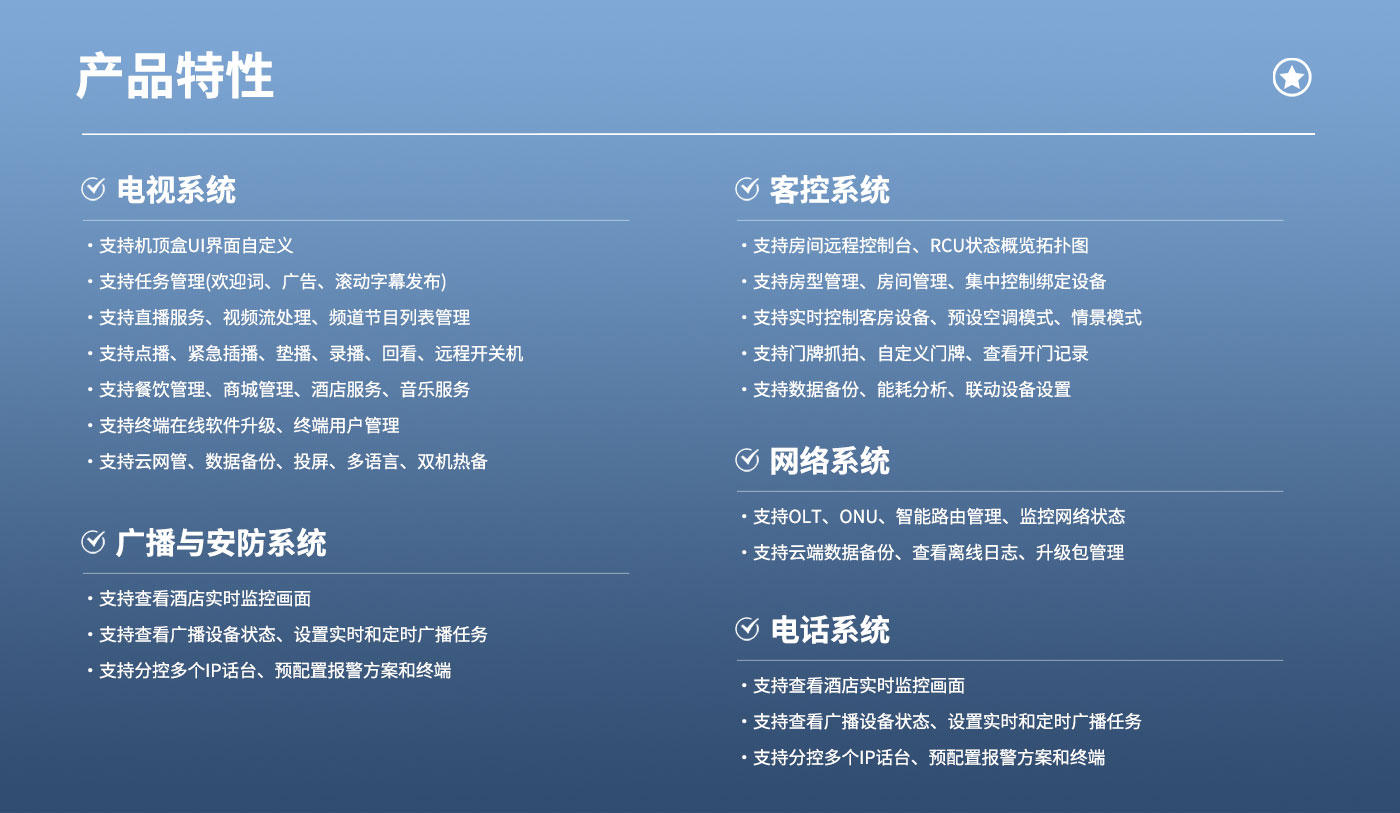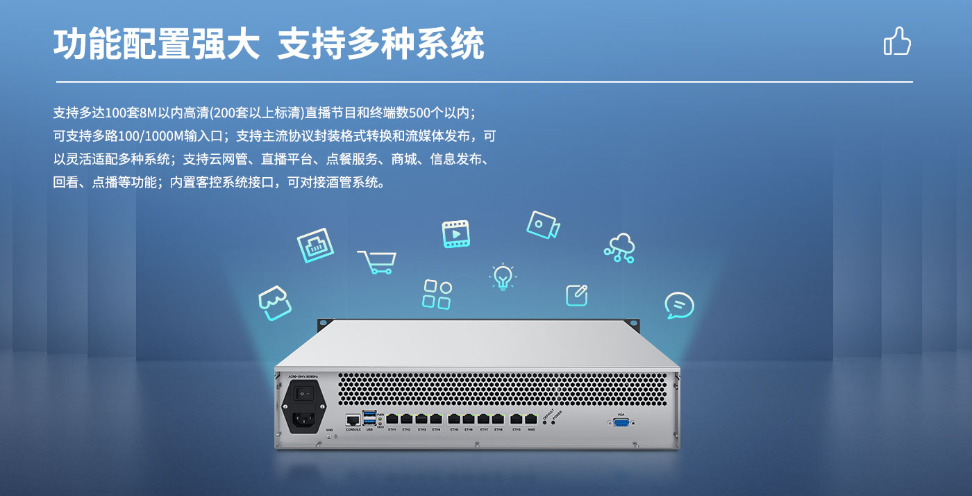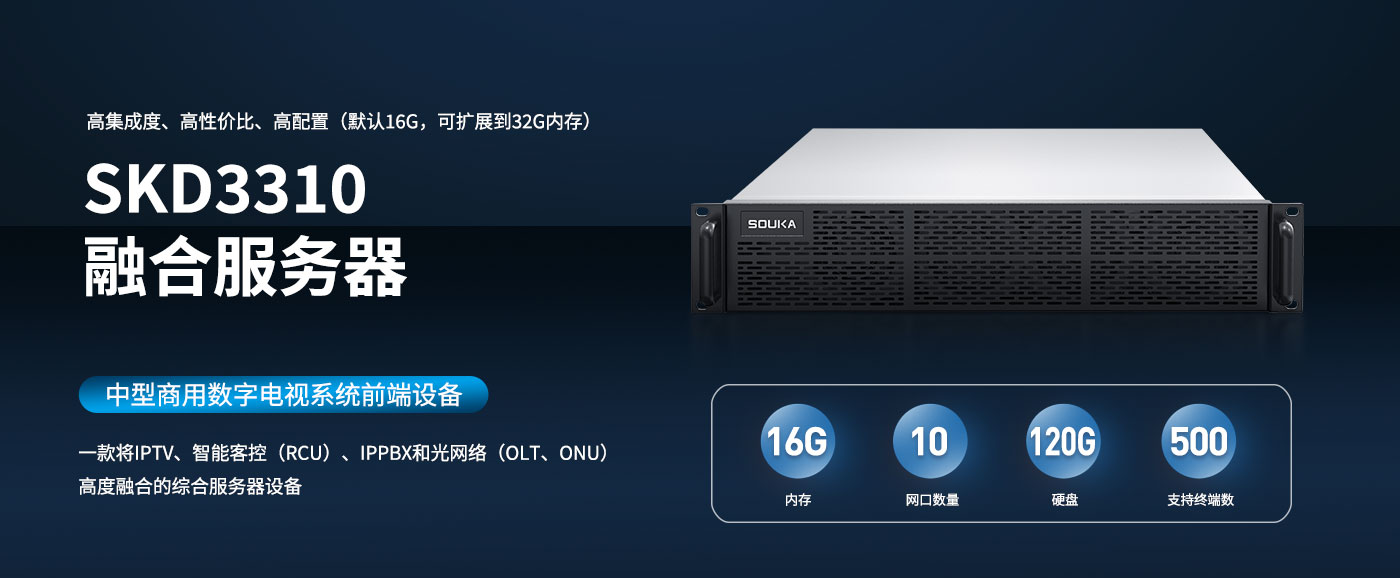 SKD3310是一款适用于商旅酒店、会所、医院、浴场、学校、休闲会所等场所的中型商用IPTV或数字电视系统的前端设备,支持多达100套8M以内高清(200套以上标清)直播节目和终端数500个以内。该产品具有高集成度、高性价比、高配置(默认16G,可扩展到32G内存)的播控服务器产品。可支持多路100/1000M输入口,支持主流协议封装格式转换和流媒体发布,可以灵活适配多种系统。支持云网管、直播平台、点餐服务、商城、信息发布、回看、点播等功能,内置客控系统接口,可对接酒管系统。